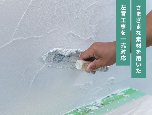 内外装問わず、左官工事一式を対応しております。モルタル・漆喰・珪藻土・聚楽(じゅらく)など、さまざまな塗り壁はお任せください。